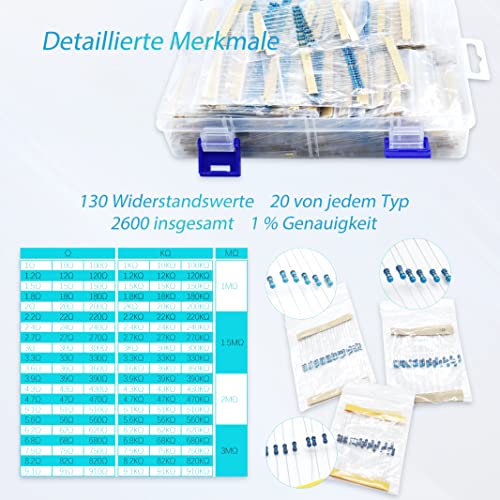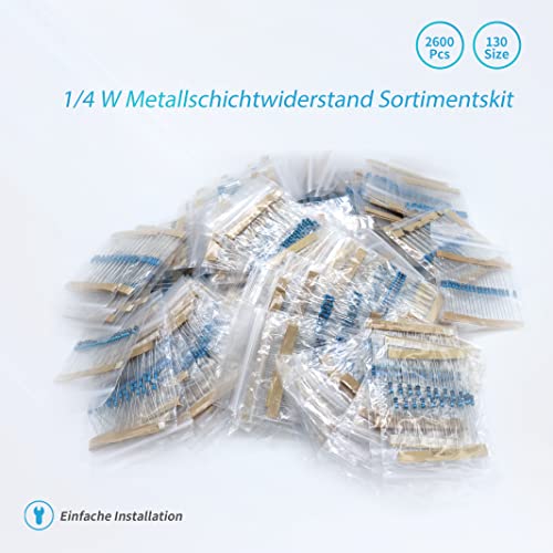 KUBOWAI Kit Combinato Resistore, 1 Ohm-3M Ohm, kit Resistore a Film Metallico 1/4 (Valore 130 2600 Pezzi)