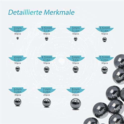 KUBOWAI 510 Pezzi Assortimento di Sfere in Acciaio con Cuscinetti a Sfera, Sfere di Metallo in Acciaio Cromato di Precisione per Pezzi di Ricambio di Ruote di Bicicletta, 2-8mm (11 Taglie)