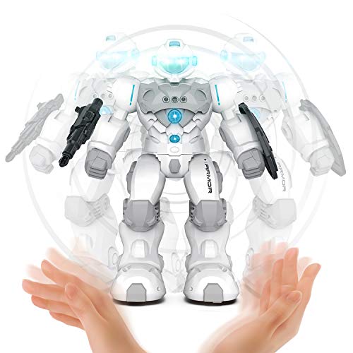 【Gesto e telecomando】: il robot intelligente può spostarsi in avanti, indietro, girare a sinistra e girare a destra semplicemente attraverso i gesti. Il robot reagisce e si muove con gli effetti sonori. È inoltre possibile utilizzare il telecomando per controllare il robot. Sono necessarie 2 batterie AAA da 1,5 V (non incluse).