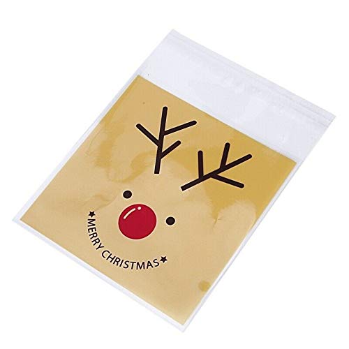 Kungfu Mall - 100 sacchetti di plastica autoadesivi, per biscotti e dolcetti, motivo: stampa di alce natalizia, in cellofan, per festa di Natale, decorazione