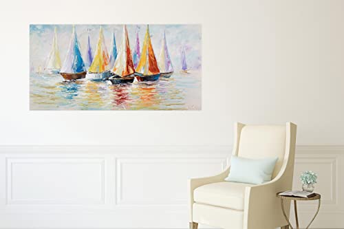 Kunstloft Quadro su tela | 100% DIPINTO A MANO | 120x60cm | Dipinto 'Rainbow Regatta' | Navi & Barche | Multicolore Bianco | Arte moderna