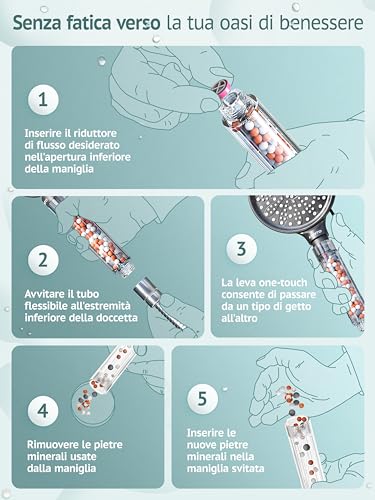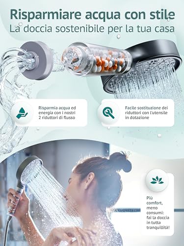 RISPARMIO DI ACQUA E DENARO CON STILE: Il nostro soffione doccia alta pressione con perle minerali è dotato di due riduttori di flusso intercambiabili che riducono il flusso d'acqua della doccia fino al 40%.