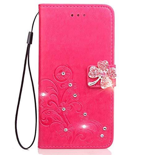 KunyFond Custodia Compatibile iPhone 6/6S Cover Portafoglio Pelle Pu Leather Wallet Trifoglio Goffratura Modello Scintillio Diamante Bling Glitter Libro Magnetico Flip Supporto Bumper,Rosa Rossa