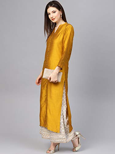 Kurti - Set da donna indiano, stile tunica kurta con palazzi, Giallo senape e bianco sporco, Large