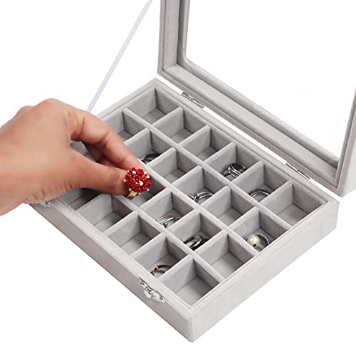 Kurtzy Organizer Gioielli Espositore Anelli in Velluto Grigio (24 Griglie) L20,2 x P15,1 x A4,6 cm - Porta Anelli Espositore con Coperchio in Vetro - Espositore per Anelli, Orecchini e Braccialetti