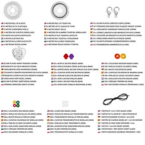 GRANDE KIT GIOIELLI FAIDATE DA 1000: Nel set per creare gioielli vi è un filo elastico, uno a coda di tigre, cordino nero, un ciondolo a cuore placcato argento, perline acriliche, perline di legno, rocaille colorate, perline trasparenti, fermagli aragosta, perni con testa in due misure, perni ad occhio, borchie, ganci per orecchini, terminali cordino in due misure, crimps ed anellini in due misure. Vedi la descrizione per quantità e dimensioni. Hanno superato il test del nichel REACH dell'UE.