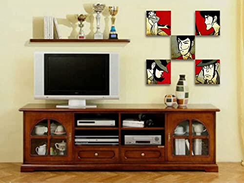 KUSTOM ART Set 5 Quadretti Stile Vintage Lupin Lupin III: Lupin, Goemon, Jigen, Fujiko, Zenigata da Collezione Stampa Laser su Legno Stampa su Legno 15x15 cm.