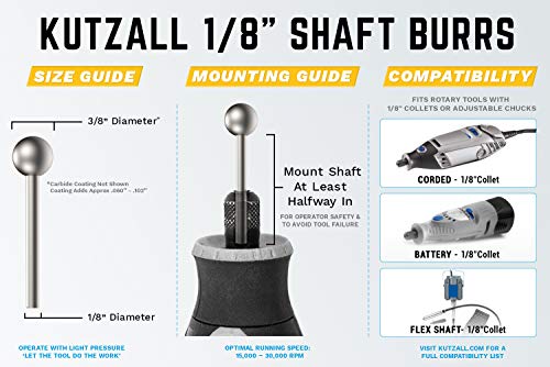 Kutzall Original Sphere Rotary Burr, 1⁄8" Shaft, Fine - Woodworking Attachment for Dremel, Foredom, DeWalt, Milwaukee Tools. Abrasive Tungsten Carbide Coating, 3⁄8" (9.5mm) Head Diameter, S-38-EG