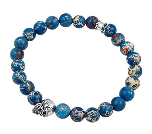 Kuzzoi Buddha Bracciale da Uomo con Agata Blu e Pietre preziose e Teschio in Argento Sterling 925, Braccialetto Yoga, Lunghezza 19-23 cm, Elastico, 0205930619 e Argento, Colore: Blu