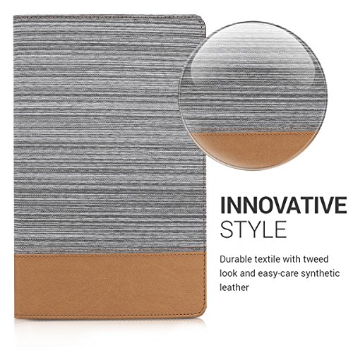 IL TESSUTO INCONTRA LA PELLE: la custodia pieghevole in nylon effetto tela grigio chiaro / marrone con inserto in resistente similpelle protegge il tuo tablet da graffi, sporco e altri influssi esterni.