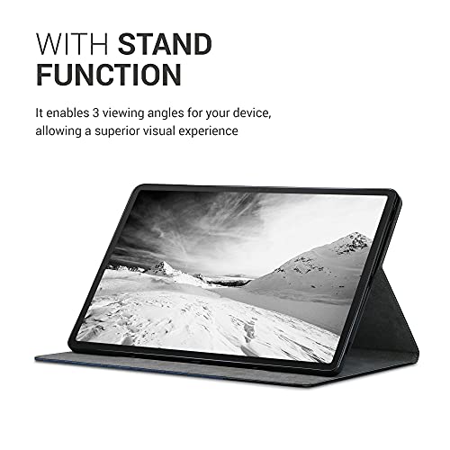 IL TESSUTO INCONTRA LA PELLE: la custodia pieghevole in nylon effetto tela blu scuro / nero con inserto in resistente similpelle protegge il tuo tablet da graffi, sporco e altri influssi esterni.