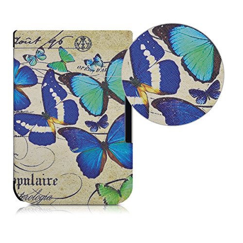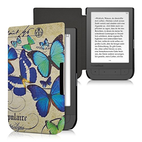 Kwmobile Cover per Pocketbook Touch HD / Touch HD 2 - Custodia a libro per eReader - Copertina protettiva libro flip case Protezione per e-book reader Design farfalle scritte blu menta beige