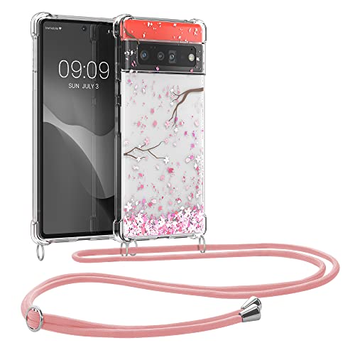 Kwmobile Cover Tracolla Compatibile con Google Pixel 6 PRO - Cover Laccio Collo - Custodia Cordino Rosa/Marrone Scuro/Trasparente Pioggia di Petali