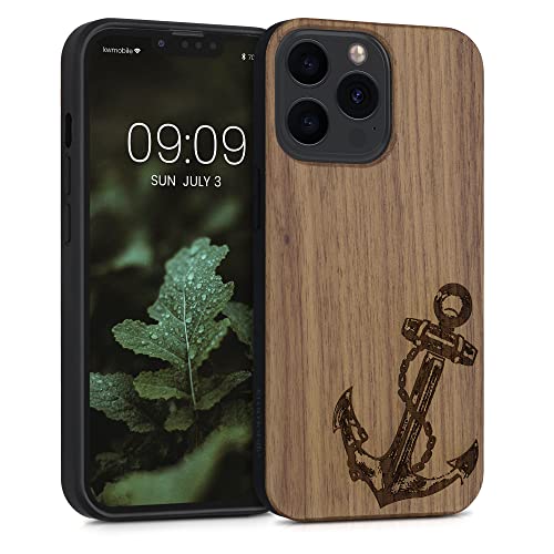 Kwmobile Custodia Compatibile con Apple iPhone 13 Pro Cover - Back Case in Legno con Bumper in Silicone TPU - Ancora felice marrone scuro