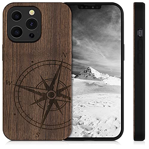 Kwmobile Custodia Compatibile con Apple iPhone 13 Pro Cover - Back Case in Legno con Bumper in Silicone TPU - Bussola vintage marrone scuro
