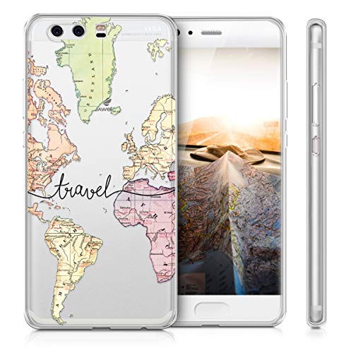 Kwmobile Custodia Compatibile con Huawei P10 - Cover Silicone TPU - Protezione Back Case - Mappa del Mondo Nero/Multicolore/Trasparente