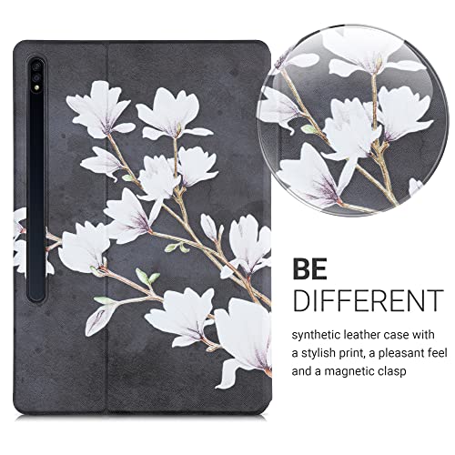 Kwmobile Custodia compatibile con Samsung Galaxy Tab S7 Plus/Tab S7 FE - Custodia Cover Tablet con supporto - Copertina in pelle PU Smart Case con Stand - Magnolie marrone grigio/bianco/grigio scuro