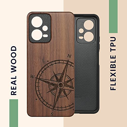 Kwmobile Custodia Compatibile con Xiaomi Redmi Note 12 5G / POCO X5 5G Cover - Back Case in Legno con Bumper in Silicone TPU - Bussola vintage marrone scuro