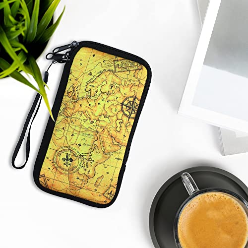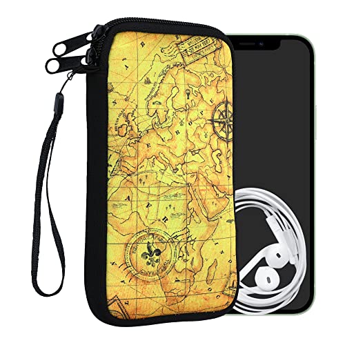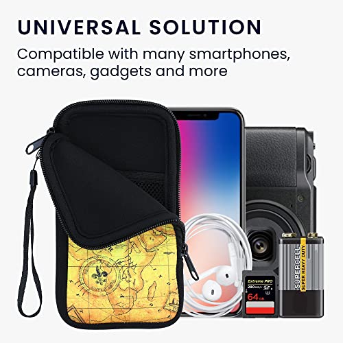 Kwmobile Custodia in neoprene con zip per smartphone XL - 6,7/6,8" - Astuccio portacellulare a sacchetto con cerniera - Borsa verticale - Mappamondo Antico nero/marrone/beige