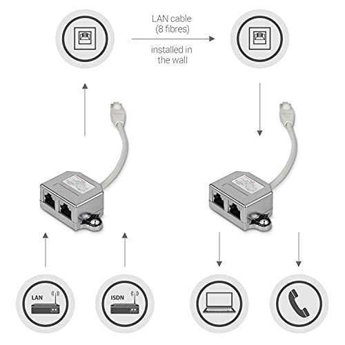 VOLUME DI CONSEGNA: nella confezione sono inclusi 2 LAN splitter (Input 1x cavo RJ 45, 8 linee / Output 1x RJ45 Ethernet LAN, 1x RJ45 ISDN).