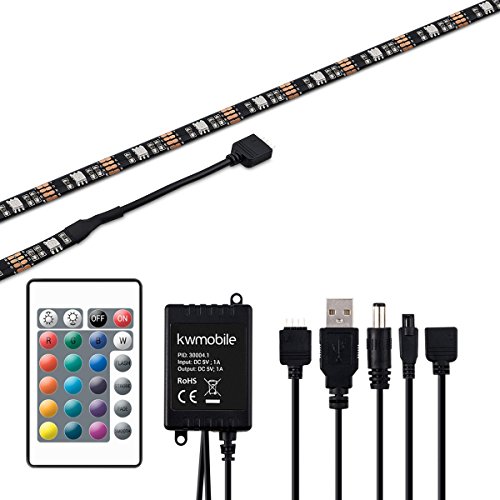 Kwmobile kit strisce LED TV - strip retro illuminazione USB RGB luci led multicolor - striscia dimmerabile 2x50cm 5V nero - alimentatore e telecomando