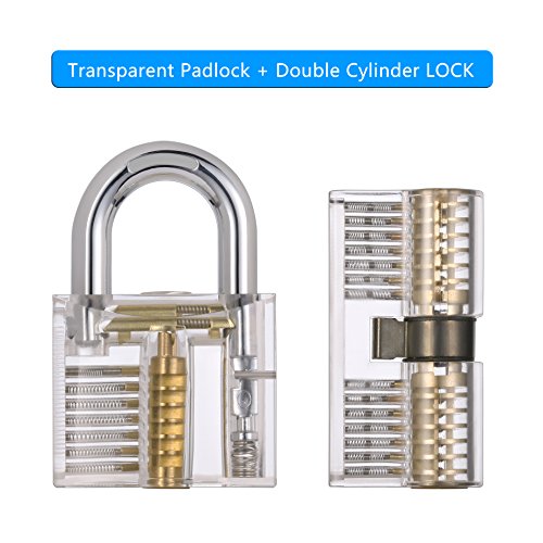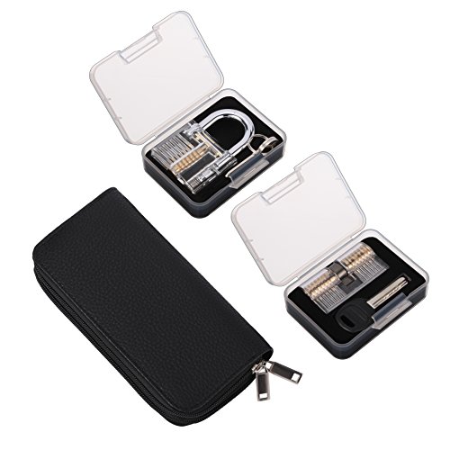 KWOKWEI - Set di 28 grimaldelli con 2 lucchetti trasparenti per allenamento, lucchetti, serratura a cilindro, set di grimaldelli con custodia in pelle per principianti, Locksmit, professionisti