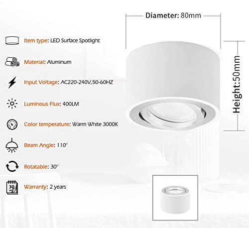 KYOTECH LED Spot Light Faretto da soffitto a LED Orientabili Ø 80 * 50mm con modulo LED intercambiabile Rotondo Bianco Apparecchio a Plafone 5W luce Calda Bianca 3000K 400LM Plafoniera LED Set da 4