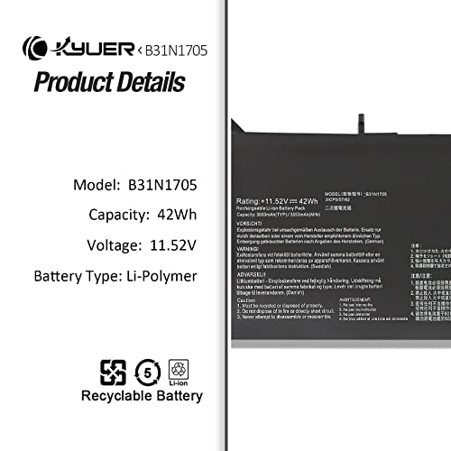 K KYUER 42Wh B31N1705 Batteria per Asus VivoBook Flip 14 TP410 TP410U TP410UA TP410UF TP410UR TP410UAR TP410URR ZenBook UX460UA Q405UA TP410UA-EC479T EC229T EC288T EC386T EC405T EC490T B31N1705-1
