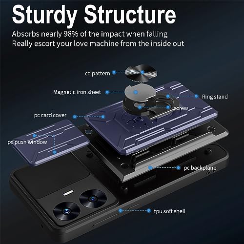 KZIOACSH Cover Compatibile con Realme C55 + Vetro Temperato[3 Pack],con Slot per Schede e Copertura per Lente Fotocamera Scorrevole,360°Rotante Anello Supporto,Blu