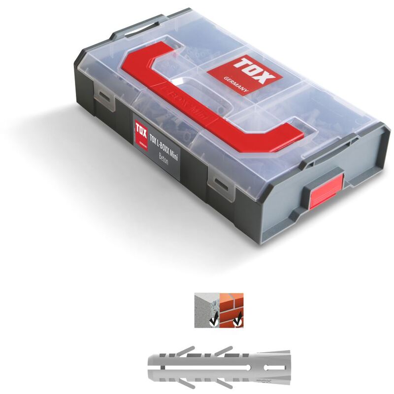 TOX L-Boxx Mini Concrete • La gamma Mini Allround L-Boxx include le dimensioni più comuni del dowel barracuda. di consegna: 5/25 x 100 pezzi., 6/30 x 120 p., 8/40 x 60 p. Dismargendo Dowel • Diverse filmate attive BR/> • Adatto anche per viti a palette • Contenuto di materiale elevato per valori di mantenimento elevati • Guida a vite sicura • Nylon 100% < Br/> • Il collo flessibile flessibile si adatta al pozzo Descrizione e area dell'applicazione • SPREIZDübel per materiali da costruzione completi • a forma di 2 volte Diffusione di corpi con rotazione e tasselli flessibili • senza alogeni • possono essere utilizzati con legno, creare viti di truciolo e stick elaborazione e assemblaggio • Bohrloch nella dimensione del diametro del tassello • In calcestruzzo e pietra piena con blow • Lunghezza a vite minima = lunghezza del tassello + spessore del componente + 5 mm • Misurazione pre -stop