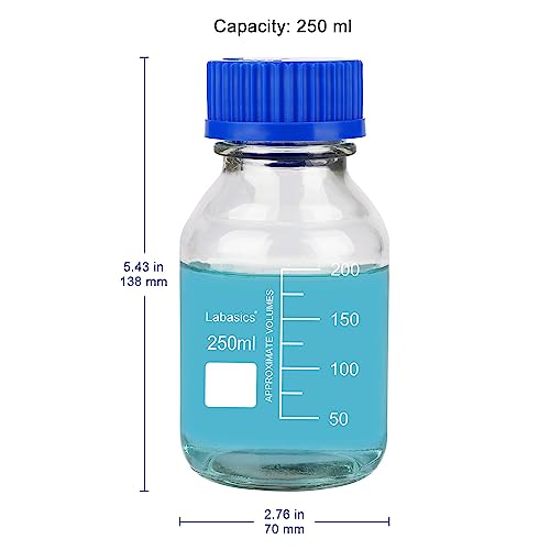 Labasics Rotondo Media Stoccaggio Bottiglie con GL45 Blu Vite Tappo, Borosilicato Vetro Cancella Ampio Bocca Laureato Rotondo Reagente Media Stoccaggio Laboratorio Vetro Flacone, 250 ml