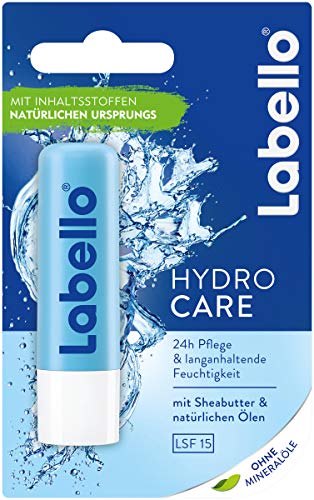 Labello Hydro Care Balsamo per labbra senza oli minerali per labbra secche, SPF 15 e burro di karitè per la protezione nutriente delle labbra