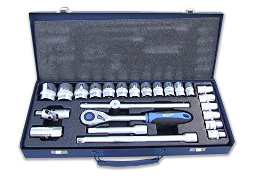 18 bussole esagonali 1/2" dal 10 al 32. 1 cricchetto reversibile. 1 snodo universale. 1 chiave per candele . 1 quadro scorrevole mm.300. 1 prolunga mm.125. 1 prolunga mm.250.