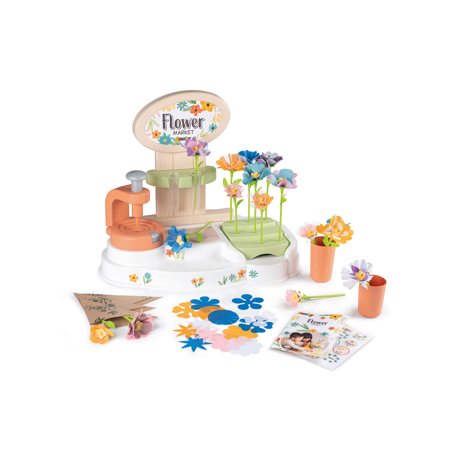 Flower Market è il Laboratorio dei Fiori di Smoby per bambini dai 3 anni. Un gioco divertente che stimola la creatività: puoi creare tanti fantastici fiori di forme e colori diversi. Una volta realizzato il bouquet puoi disassemblare i fiori e ricominciare di nuovo. Il gioco si compone di una macchina semplice e veloce da utilizzare: basta scegliere i propri petali e inserirli nella pressa insieme a peduncolo e pistillo. Il prodotto include più di 100 accessori: 47 petali in tessuto, 8 steli grandi, 8 steli piccoli, 16 peduncoli, 16 pistilli, 2 vasi, 2 tubi trasparenti, 3 coni per avvolgere i tuoi mazzi di fiori, adesivi per decorare i tuoi bouquet, 1 libretto illustrativo con le istruzioni. Oltre ai petali forniti nel set, è possibile ritagliare le sagome sulla confezione per disegnare e creare nuovi petali a partire da vecchie stoffe. Un'idea per insegnare ai bambini l'importanza del riciclo creativo.