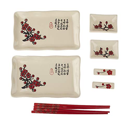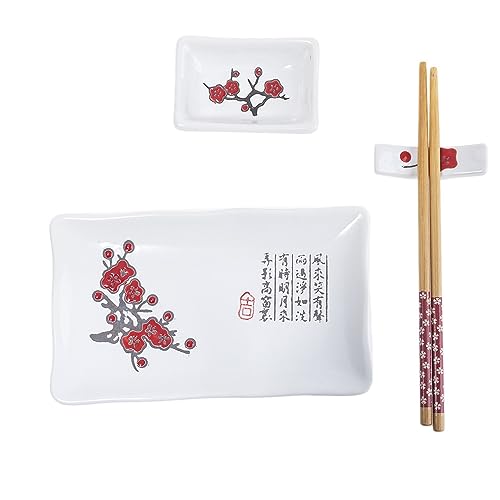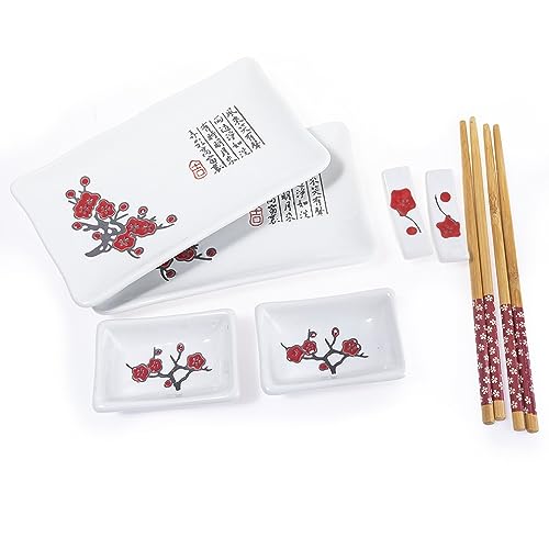 'SERVIZIO per pasti giapponesi, speciale sushi, per 2 persone, con una decorazione tradizionale del Giappone "fiori di ciliegio. Questo servizio giapponese sushi si compone di: - 2 piatti in porcellana bianca di 19,5 x 12,5 centimetri con una decorazione giapponese fiori di ciliegio. - 2 sauciers in porcellana bianca di 9 x 6 centimetri con una decorazione giapponese fiori di ciliegio. - 2 paia di bacchette in bambù, decorazione varia. - 2 supporti a bacchetta.