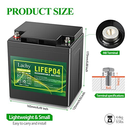 【BATTERIA A CICLO PROFONDO DI ALTA QUALITÀ E LUNGA DURATA DI SERVIZIO】 La batteria al litio da 12 V Lachy può fornire più di 3000 cicli e 10 anni di durata. La durata è da 5 a 8 volte superiore a quella di altre batterie. Adottare celle LiFePO4 di grado automobilistico con maggiore densità di energia, prestazioni più stabili e maggiore potenza, mantenere la capacità con un basso tasso di autoscarica (inferiore a 100μA).