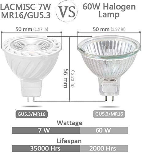 Lampadina LED a risparmio energetico - La lampadina Lacmisc GU5.3 MR16 è realizzata in ABS e alluminio. Con una durata di 35.000 ore e fino a 100.000 cicli di accensione, fornisce immediatamente 450 lumen di luce, senza tempo di attesa per riscaldarsi a piena luminosità