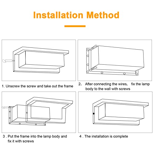 【Facile da installare】 Utilizzare il fermaglio per collegare il cavo domestico al cavo della lampada da parete. Per prima cosa allentare le viti, rimuovere la cornice, avvitare il corpo lampada alla parete;