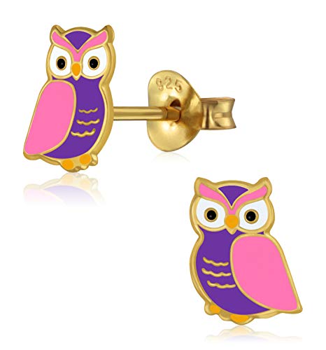 Laimons Orecchini da bambina a forma di gufo, placcati oro, viola, rosa, in argento Sterling 925