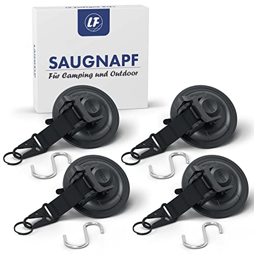 LAINFELD Ganci a ventosa | Set da 4 pezzi con chiusura a moschettone e gancio grande | extra forte | grandi ventose per campeggio, auto, balcone | gancio a ventosa