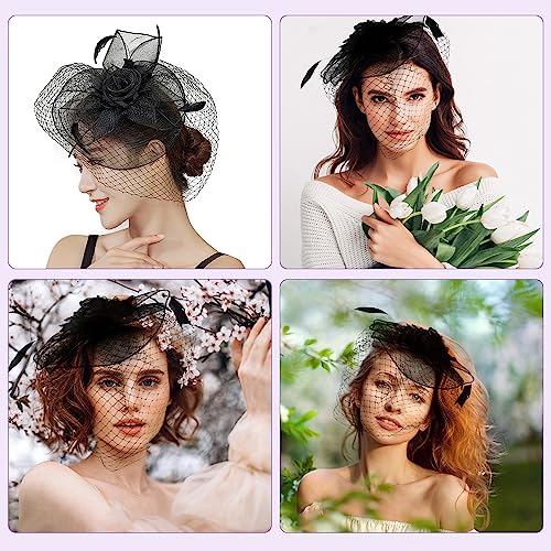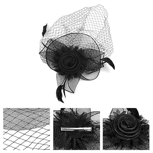 LAISHUNHE Cappello Fascinator Cappelli Eleganti Donna Cappello da Cerimonia Fascinator Clip di Capelli Fascia in Velo a Rete di Piume Nero da Donna per Mascherate, Carnevale Matrimonio, Festa