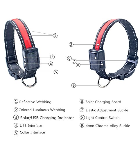 LaiXin Collare Cane, Collare Luminoso per Cani con USB e Ricaricabile Solare, Impermeabile Collare LED per Cani Ricaricabile, Rosso(S, 30cm~40cm, 7.5kg~15kg)