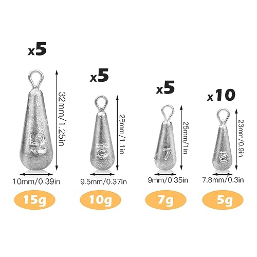 LAKSOL 25 Pezzi Piombo da Pesca Pesi da Pesca a Piombo Piombi da Pesca 5g/7g/10g/15g Piombo da Pesca Forma di Goccia Piombini da Pesca con Scatola Portaoggetti per Pesca All'aperto