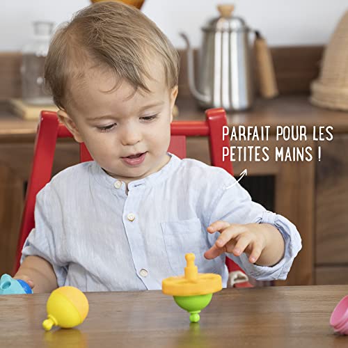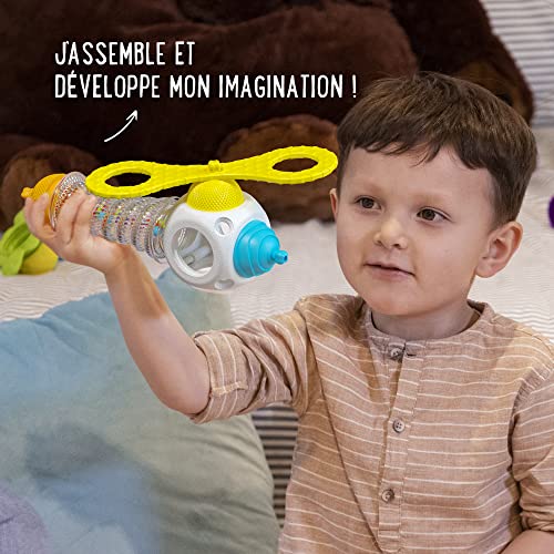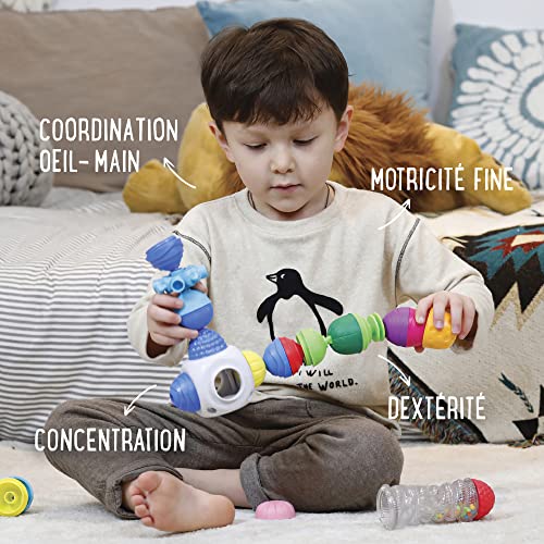 Giocattoli evoluti: a 10 mesi, posiziona le scoperte sensoriali grazie alle diverse texture e colori delle perle e dei giocattoli. A15 mesi, il bambino apre e chiude le perle. Scoprono i diversi giocattoli. A 18 mesi, il bambino può mescolare le perline e utilizzare ogni giocattolo separatamente. A 24 mesi, l'ora è alla costruzione. Il vostro bambino unisce i diversi elementi e scopri molte possibilità che manchino tutta la sua attenzione. A 36 mesi e oltre, il bambino inizia a utilizzare le ruote come una trottola interconnette le perline e i giocattoli per costruire forme ogni giorno diverse. Utilizza il tutore di trazione, primo passo nell'apprendimento della scrittura.