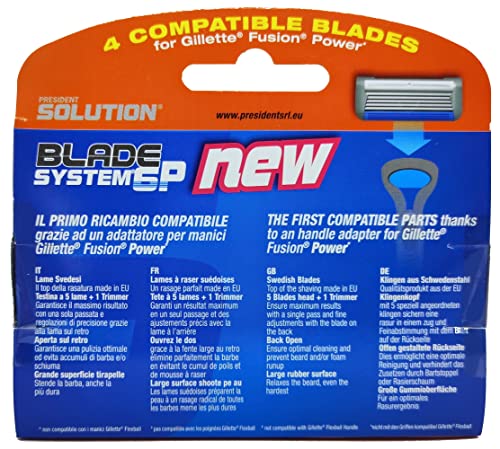 Le lamette da barba President Solution sono compatibili con tutti i manici Gillette Fusion Power. NON COMPATIBILI CON I MANICI FLEXBALL Grazie ad un brevetto mondiale si adattano al manico con un connettore collegato ad ogni lama mantenendo pari lunghezza e inclinazione dell'originale