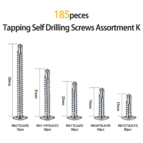5. Il pacchetto include: totale 185 pezzi di viti autoforanti per metallo, inclusi 80 pezzi M4,2 x 13 mm, 45 pezzi M4,2 x 19 mm, 30 pezzi M4,2 x 25 mm, 20 pezzi M4,2 x 31 mm, 10 pezzi M4,2 x 50 mm. Una varietà di dimensioni e quantità per soddisfare le vostre differenti esigenze d'uso.