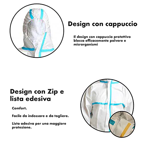 DESIGN SICURO E CONFORTEVOLE: Indumento protettivo caratterizzato da cuciture interamente ricoperte e sigillate da nastro di colore azzurro, cappuccio con elastico, cerniera lampo nella parte anteriore con patta copri-cerniera e striscia adesiva per garantire un elevato livello di ermeticità contro i liquidi e mantenere alto lo standard di protezione.