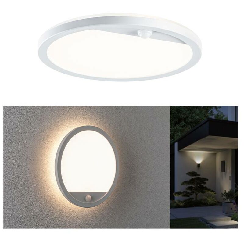 LED pannello esterno lamina con rilevatore di movimento - IP44 Round 280mm 1900LM 14.5W 3000K bianco con luce di sfondo Le soluzioni di illuminazione esterna per le aree costiere Le luci da esterno nel ciclo costiero sono soggette a influenze ambientali più difficili come luci esterne nell'entroterra. Il contenuto di sale dell'aria qui attacca i metalli e le plastiche più fortemente. Realizzato in plastica di alta qualità, la lamina del pannello esterna corrode nelle dimensioni 280mm non vicino al mare. Sia sul muro che la coperta diffonde il pannello rotondo con la cornice bianca e la superficie bianca bianca bianca della superficie interna piana. La luce di sfondo aggiuntiva crea un'atmosfera piacevole e imposta il muro / soffitto soprattutto nella scena. Il rilevatore di movimento garantisce che la luce del buio sia automaticamente preoccupata non appena qualcuno si avvicina. Le diverse funzioni del rilevatore di movimento possono essere regolate tramite un interruttore