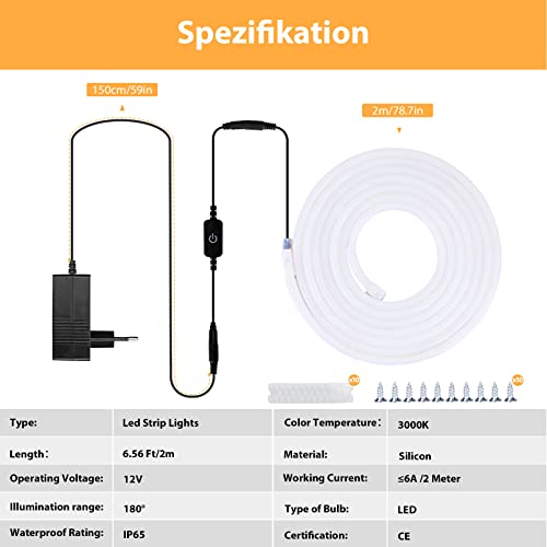 Lamomo Striscia LED 2m, Striscia LED Neon, Bianco Caldo 12V 3000K LED Strip, Dimmerabile, Impermeabile IP65, Silicone, Flessibile, con alimentatore di rete e controller, para Interior Exterior, DIY