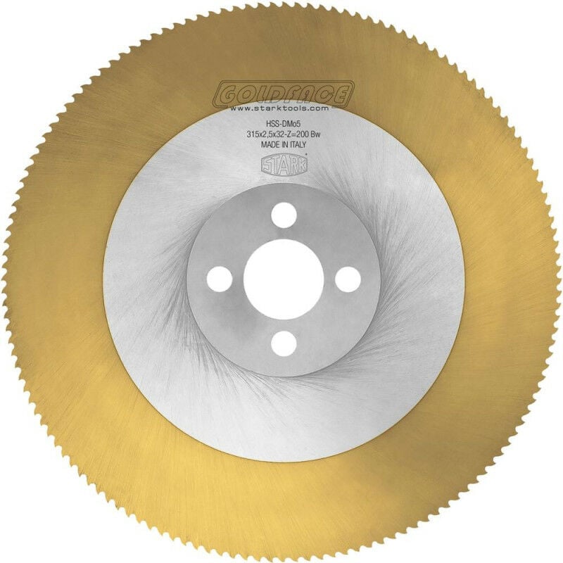 Lama circolare in metallo HSS. Rivestita in TiN - HSS-DMo5 - Angolo di taglio 18° - Angolo di spoglia 12° - Il rivestimento in TiN riduce la saldatura sui fianchi del dente - Da utilizzare su macchine manuali. e completamente automatiche Forme dei denti: BW = dente curvo con smussatura alternata fino a 4 mm di passo del dente. HZ = dente curvo con pretaglio e posttaglio per tutti i passi del dente superiori a 4 mm.